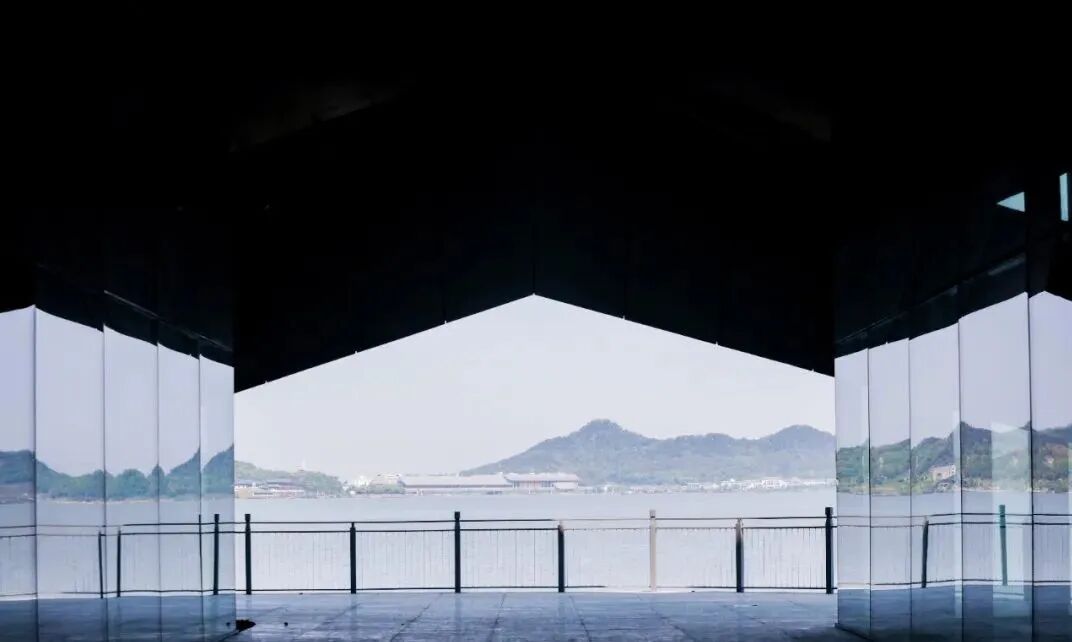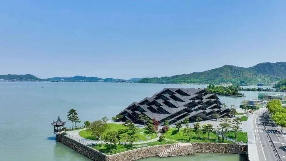 韩岭美术馆,伫立在中国东海沿岸浙江宁波郊外的东钱湖畔,这片区域自古作为连接宁波和象山港的枢纽而繁荣兴盛。而这座外观造型呈三角状的美术馆,立面材料选用的陶片,设计成了一座“小山”,这座小山既是建筑,又同时作为围绕着东钱湖群山中的山脉之一,融入到了周边的景观之中。
